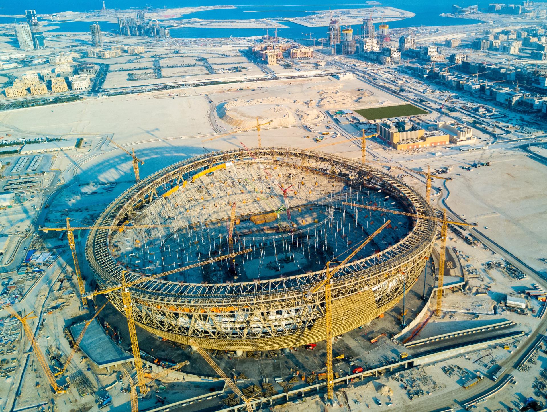 △中聯(lián)重科塔機(jī)助建盧賽爾體育場(chǎng)(圖片來源:鐵建國(guó)際)
