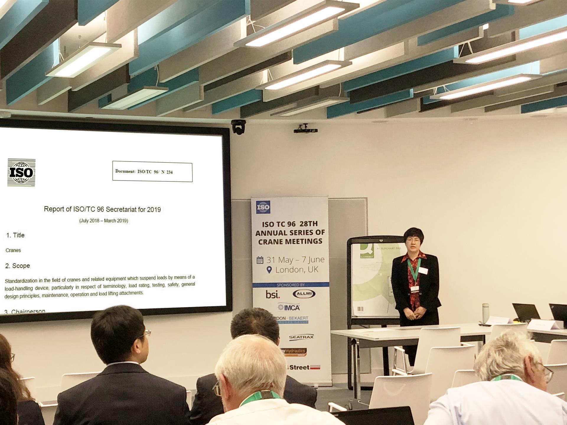 ▲中聯(lián)重科副總裁、ISO/TC96秘書付玲博士在會上作秘書處工作報告