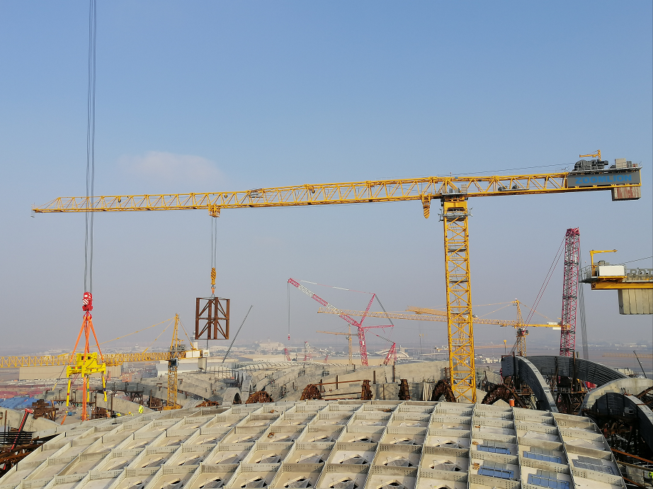 資料顯示,科威特新機場是該國的主要項目之一,預(yù)計工期為6年。新機場的容量為年1300萬人次,后期會增加至2500萬人次。該項目將有助于將科威特打造成為重要的區(qū)域中心。新機場航站樓的核心區(qū)域為一個巨大的穹頂,使用鋼結(jié)構(gòu)和混凝土PC構(gòu)件組成,施工頗具挑戰(zhàn)性。鋼構(gòu)件銜接吊裝對塔機的起升平穩(wěn)性和微動性有極高要求;混凝土PC構(gòu)建單件物件重,除了需要塔機具有良好的微動性能外,還要有強大的起重能力;此外,作為航站樓的中心部分,吊裝物料重、工作量大,對塔機的穩(wěn)定性也提出了較高的要求。
