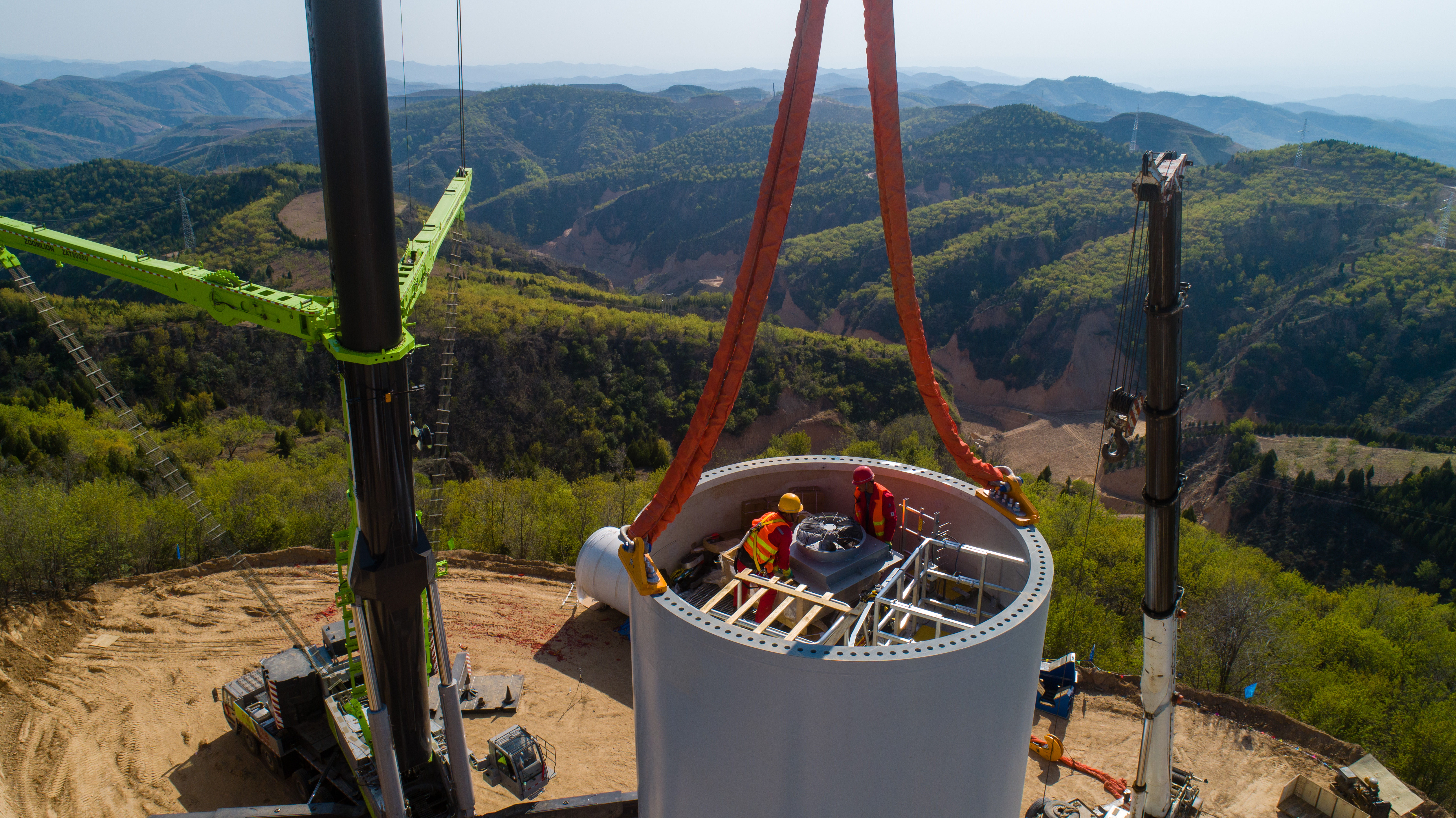 ? ?4月28日,隨著**后一根數(shù)十米長的風(fēng)機葉片徐徐上升,在近百米的高空與輪轂精準對接,山西省石樓縣小蒜鎮(zhèn)風(fēng)電建設(shè)項目又完成了一臺風(fēng)機吊裝。湛藍的天空下,中聯(lián)重科極光綠起重機臂架高聳挺立于山頂,展開的超起機構(gòu)如同張開雙翅,蔚為壯觀。中聯(lián)重科800噸全地面起重機用卓越的性能和高效的施工不斷地續(xù)寫著“風(fēng)電神器”的佳話。