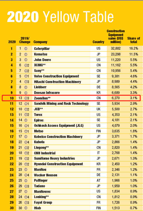 ? ?近日,英國KHL集團(tuán)發(fā)布了一年一度的全球工程機(jī)械制造商50強(qiáng)排行榜《2020 Yellow Table》。榜單顯示,中聯(lián)重科以60多億美元的銷售總額位列榜單前十強(qiáng),充分凸顯了中聯(lián)重科近年來取得的高質(zhì)量、高效率、可持續(xù)發(fā)展成果。