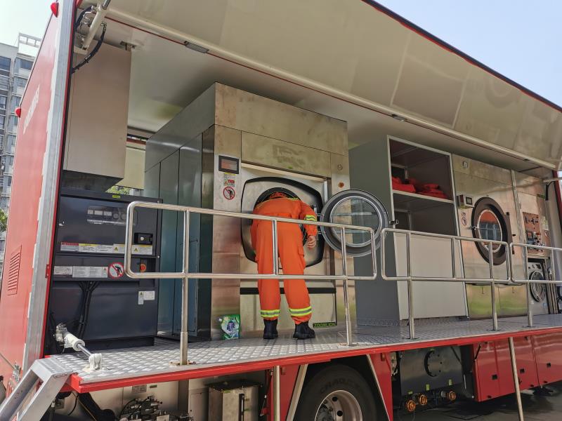 據(jù)介紹,中聯(lián)重科大型被服洗滌車結(jié)合洗滌設備特點和應急救援實戰(zhàn)中衣物洗滌需求創(chuàng)新設計而成。被服洗滌車工作能力強大,單次工作(約一小時)**大可洗脫、烘干100kg衣物,能將臟衣物快速處理成潔凈、干爽的衣物。同時,車輛采取獨有專利技術,全程一鍵控制,自動選擇洗滌參數(shù),滿足多種消防衣物洗烘需求,快捷高效。此外,車輛還擁有舒適的工作環(huán)境,裝備了超靜音發(fā)電機和靜音水泵,有效降低工作噪聲。作業(yè)空間大,超大儲物容積可滿足多種儲存需求。