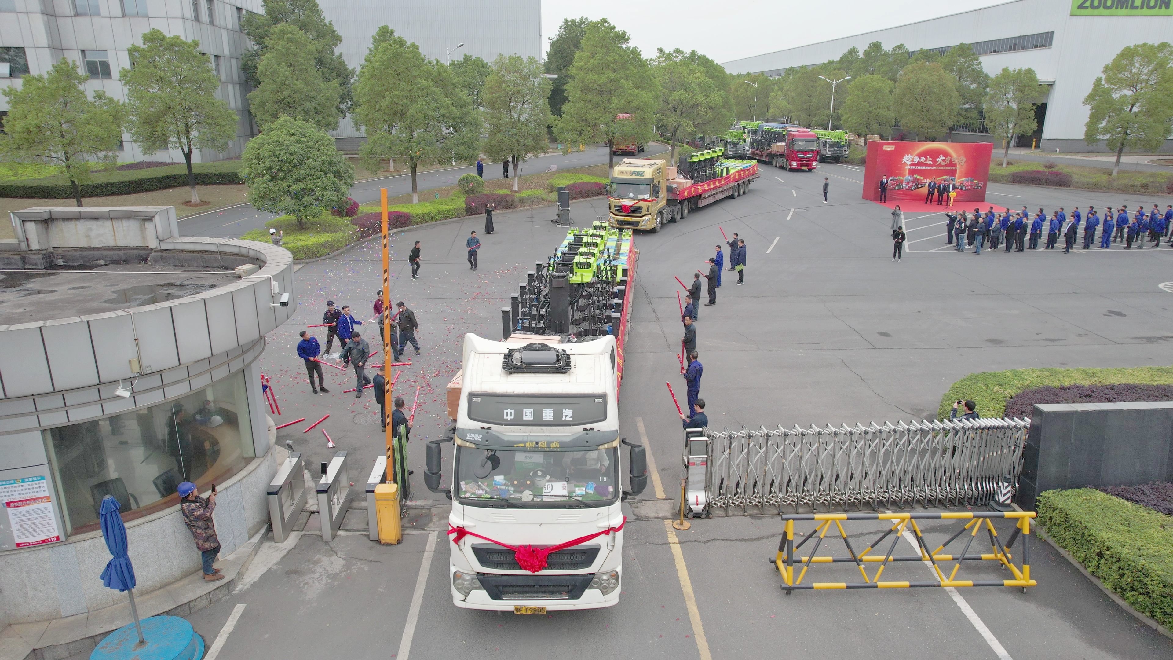 3月12日上午,在中聯(lián)重科常德漢壽園區(qū),一輛輛載著隨車吊產品的貨車排成長龍,隨著中聯(lián)重科工起公司總經理助理王立明的一聲令下,這些隨車吊產品在禮炮與掌聲中緩緩駛出了漢壽基地的大門,奔向了無限廣闊的市場,為各地建設提供新助力。