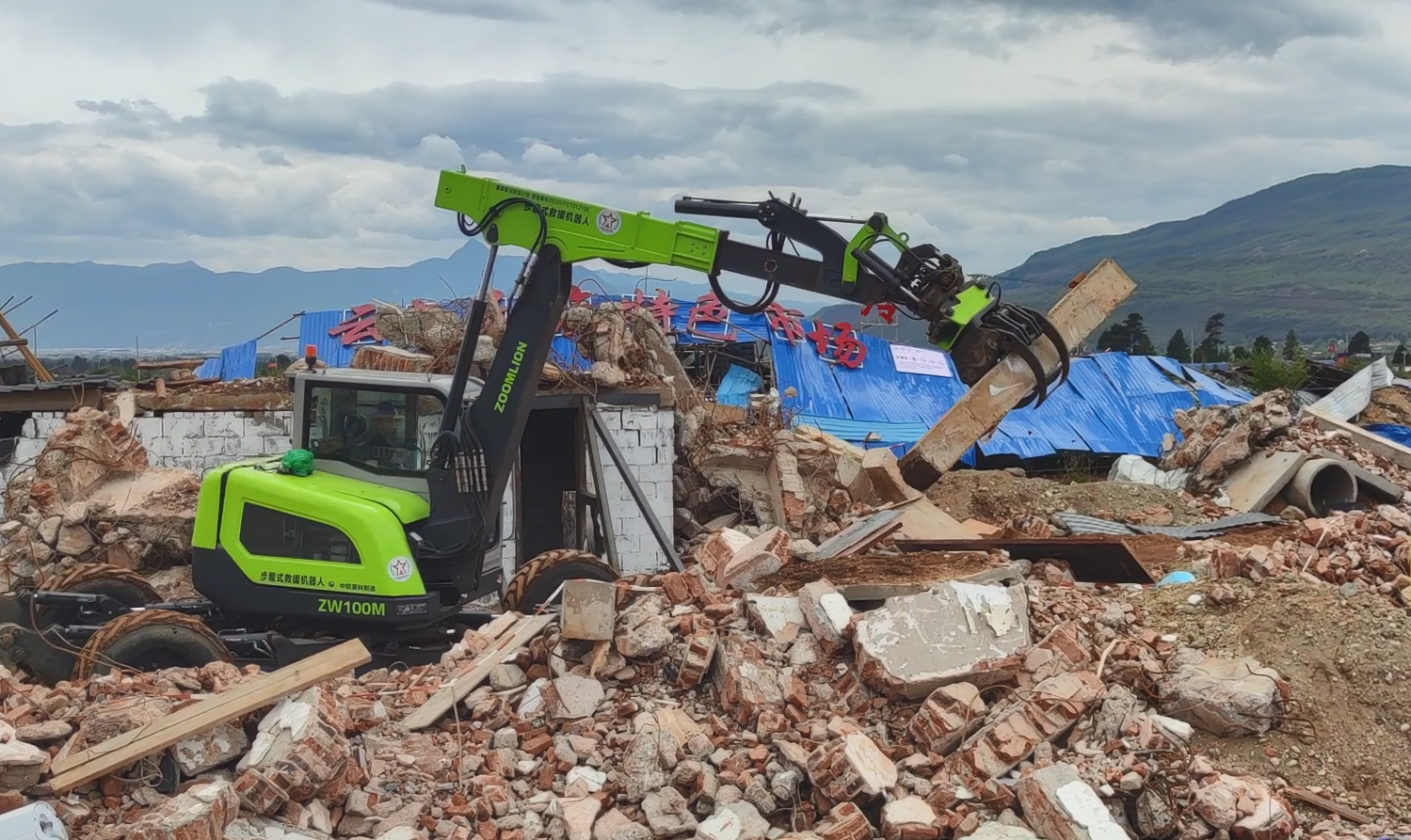 ▲中聯(lián)重科高機動多功能模塊化救援裝備正在清理障礙