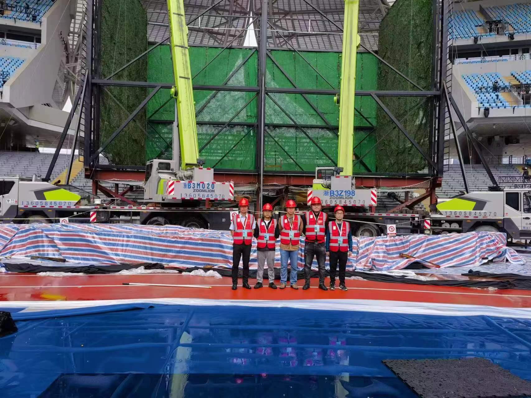 “作為亞運會主火炬塔創(chuàng)制者大豐實業(yè)的合作單位,這次我們總共派出了3臺中聯(lián)重科吊車,一臺50噸、兩臺25噸。主火炬塔立柱**高達(dá)19米,所有立柱形狀不規(guī)則且有弧度,在21 x 10米的場地上吊裝,對吊車的穩(wěn)定性、微動性和吊裝的精準(zhǔn)度要求非常高,對接精度需要達(dá)到毫米級。從4月中旬進(jìn)場到6月初,中聯(lián)重科起重機憑借強大的工況適應(yīng)性,全程以穩(wěn)定、高效、可靠的表現(xiàn),圓滿完成此次安裝任務(wù)?!庇嘁α⑵狡鹬匕惭b有限公司負(fù)責(zé)人周曉黎介紹說。