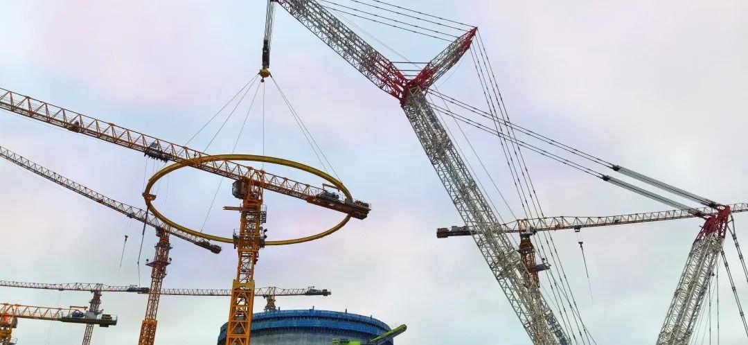 ▲中聯(lián)重科起重機(jī)正在吊裝昌江核電4號(hào)機(jī)組環(huán)梁環(huán)軌(圖片源于“華能昌江核電”公眾號(hào))