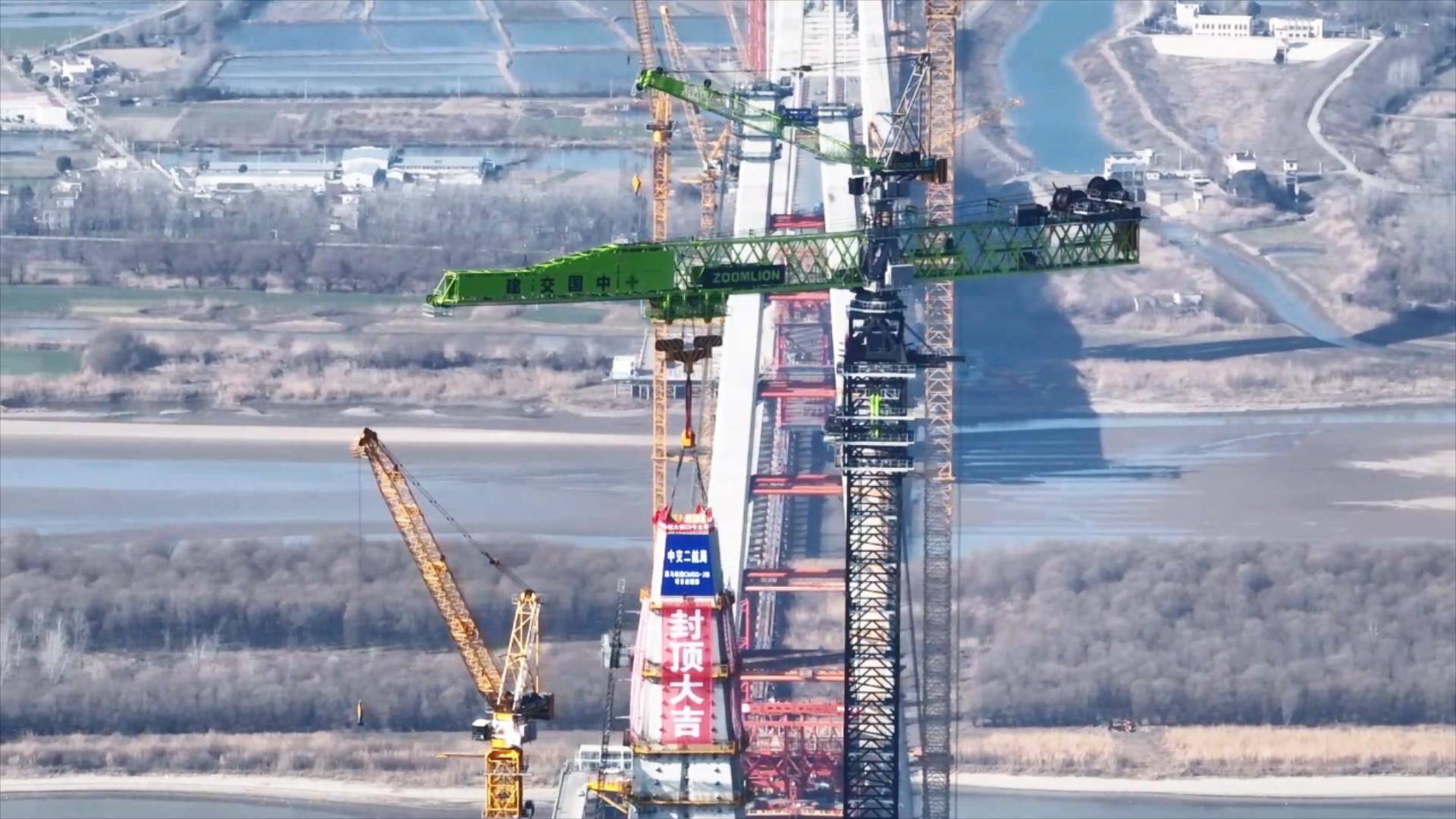 ▲中聯(lián)重科全球**大塔機(jī)完成馬鞍山長(zhǎng)江公鐵大橋南主塔封頂?shù)跹b