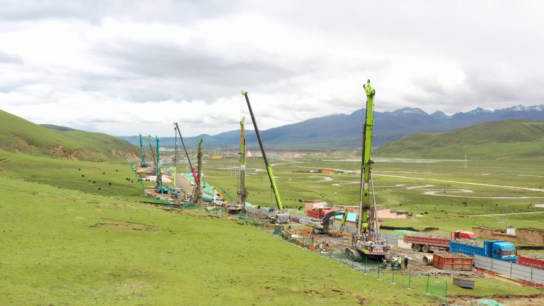 △中聯(lián)重科旋挖鉆機(jī)群、起重機(jī)等設(shè)備在川西高原助建理塘縣格者村特大橋