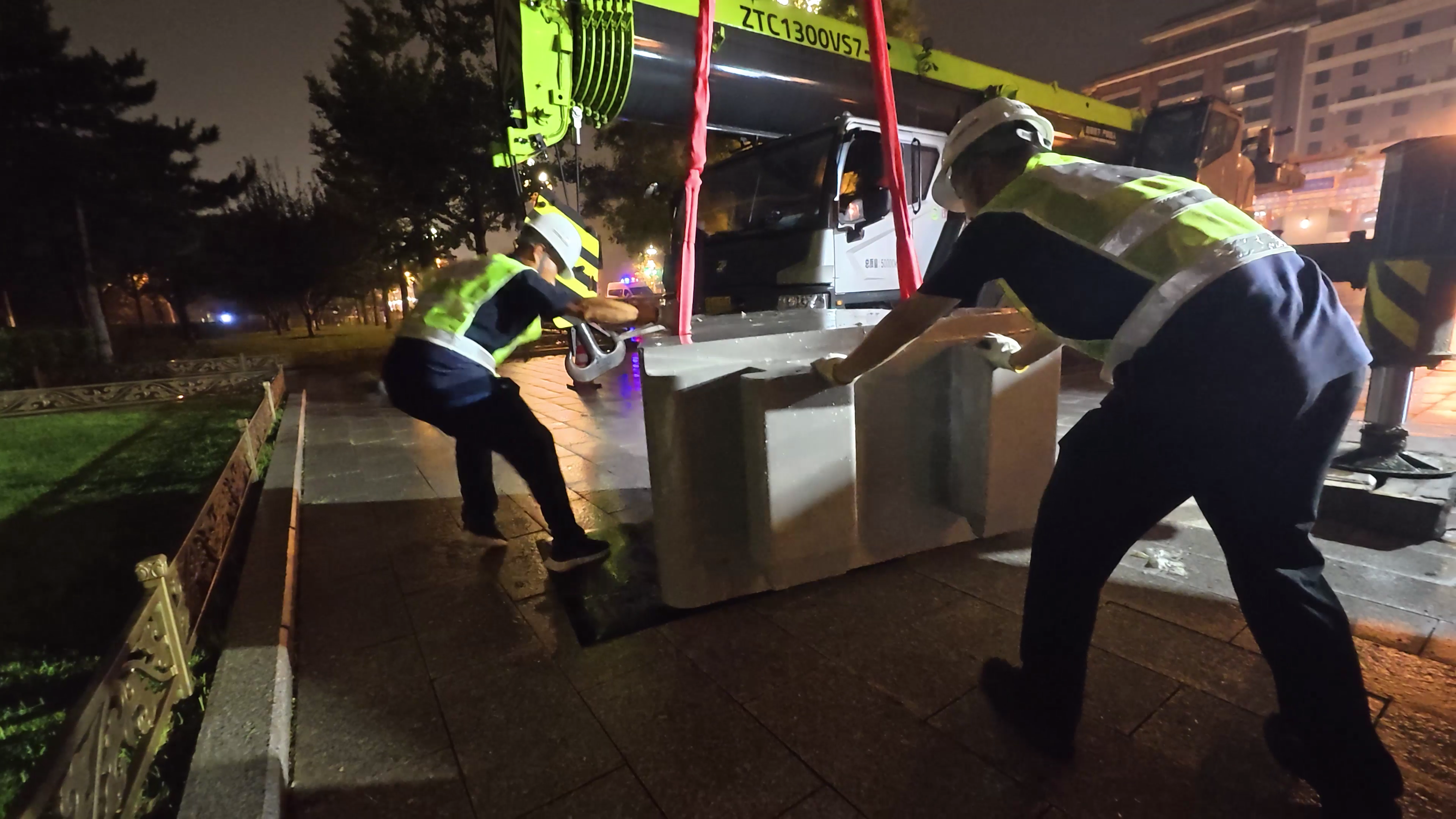一次在閱兵村內(nèi)進(jìn)行模擬演練時,在前期索道設(shè)備安裝中,需臨時調(diào)整配重安置點(diǎn),現(xiàn)場又沒有轉(zhuǎn)運(yùn)設(shè)備,時間非常緊迫。中聯(lián)重科項(xiàng)目組迎難而上,用手抬、用肩扛、用撬棍撬,硬是將2噸重的配重合力移動200米,為索道安裝節(jié)點(diǎn)贏得寶貴時間。