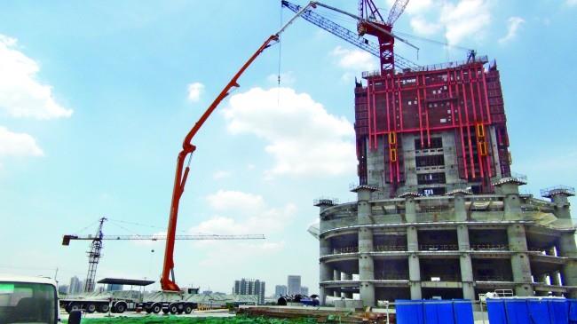 (中聯(lián)重科101米長臂架泵車在武漢施工。)