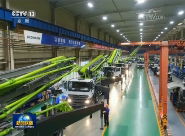▲央視新聞聯(lián)播報(bào)道中的中聯(lián)重科麓谷工業(yè)園泵車總裝車間