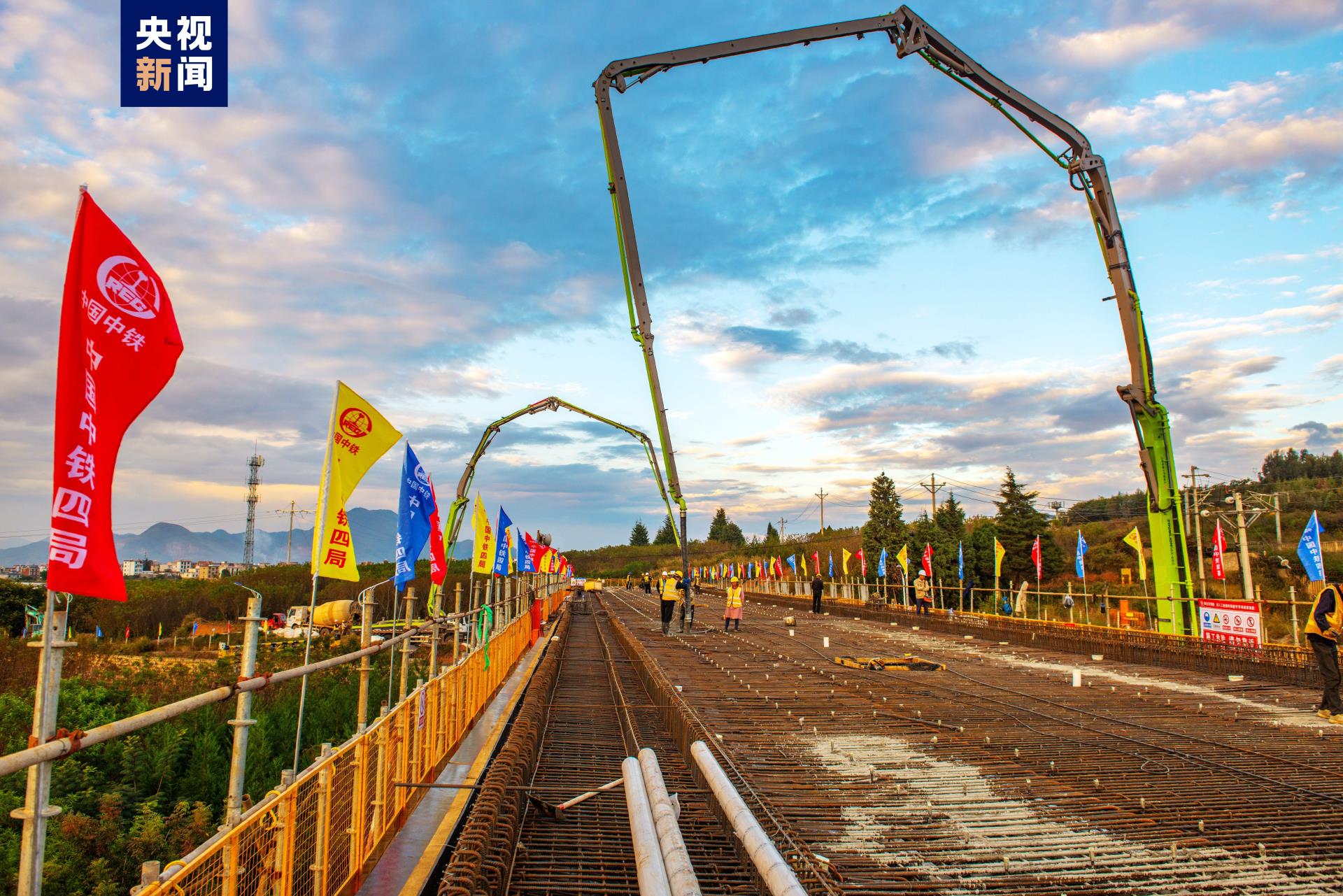 據(jù)悉,此次澆筑的云南段首座大橋是嵩明蔡家村3號(hào)大橋,位于云南省昆明市嵩明縣境內(nèi),主跨連續(xù)梁為三跨,與滬昆高鐵平行、上跨鄉(xiāng)村公路,連續(xù)梁為鋼筋混凝土箱梁,梁面寬度12.6米,梁底寬度5.5米,采用支架現(xiàn)澆法施工。由于大橋結(jié)構(gòu)和工藝的特殊性,澆筑工作需不間斷持續(xù)進(jìn)行。