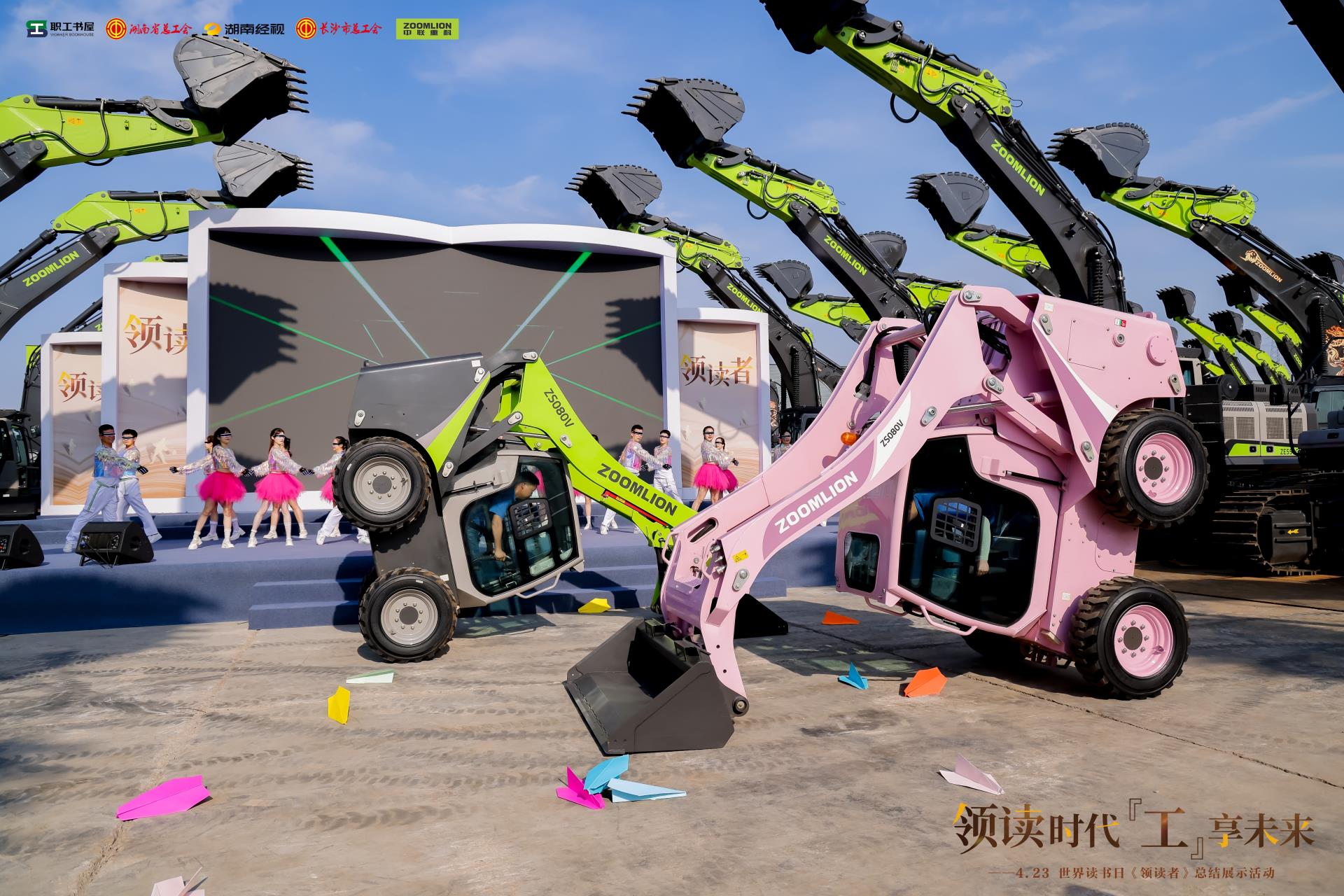 陽光下,中聯(lián)重科智慧產(chǎn)業(yè)城內(nèi),一臺(tái)臺(tái)挖掘機(jī)整齊排列、環(huán)繞舞臺(tái),展現(xiàn)工業(yè)與科技的結(jié)合之美。中國(guó)工程院院士、茶學(xué)專家、湖南師范大學(xué)校長(zhǎng)劉仲華,中國(guó)作協(xié)主席團(tuán)委員、湖南省作家協(xié)會(huì)原主席、作家王躍文,湖南省音樂家協(xié)會(huì)理事、知名音樂人袁樹雄,與勞模代表、工匠“領(lǐng)讀者”紛紛走上舞臺(tái),通過書籍分享、情景講述、詩詞吟誦、歌舞表演等形式,呈現(xiàn)一場(chǎng)屬于所有職工的閱讀視聽盛宴。
