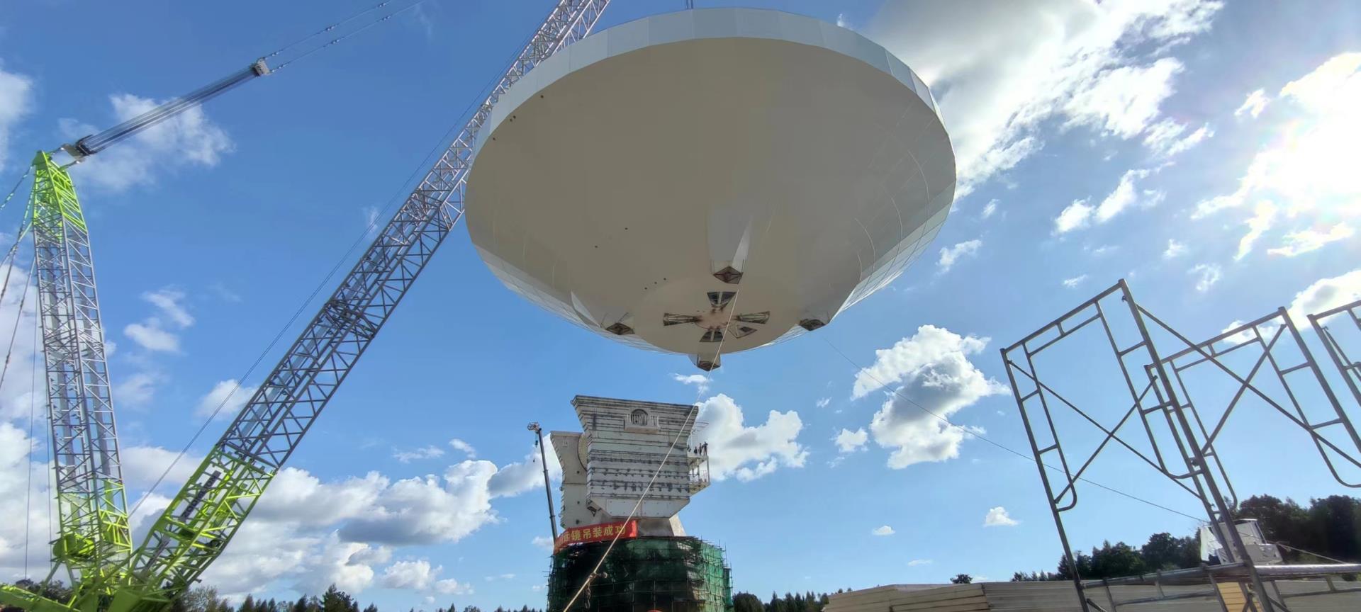 ▲中聯(lián)重科起重機吊裝長白山40米射電望遠(yuǎn)鏡(圖片來源于公眾號“中國電科”)