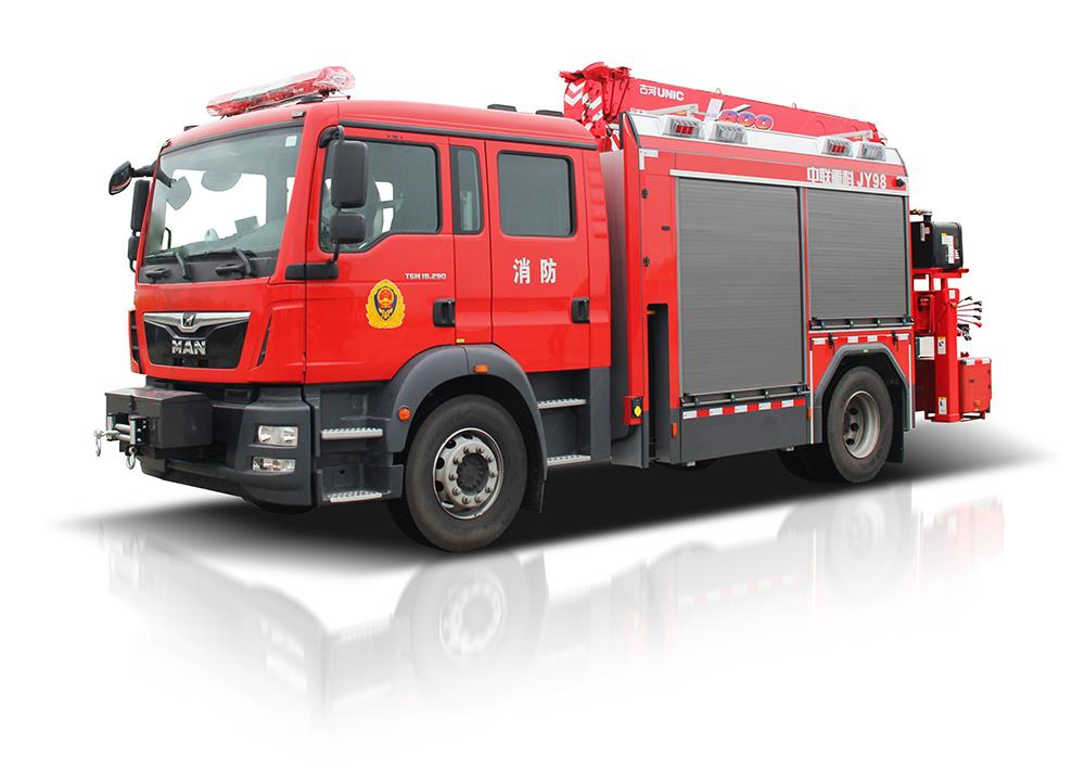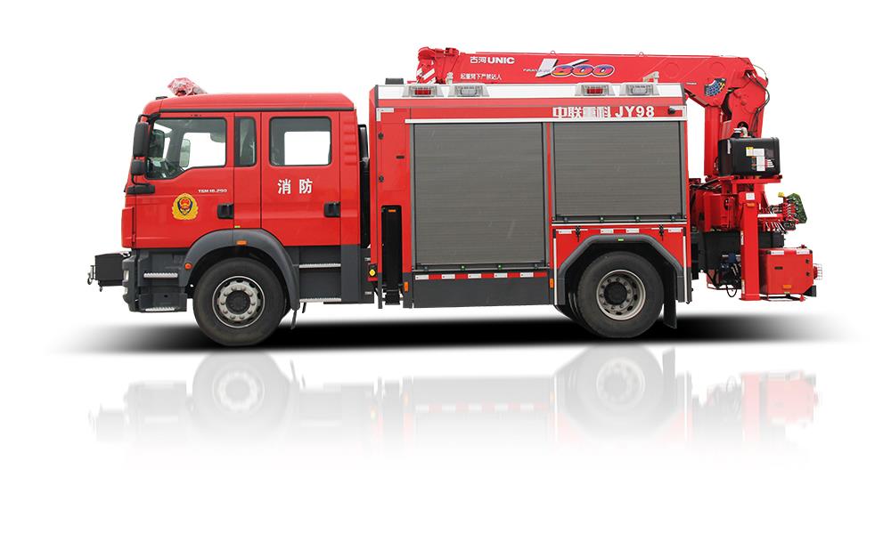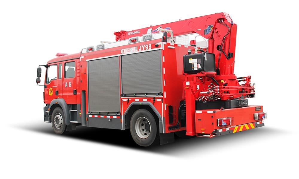 中聯(lián)重科JY98型搶險救援消防車,結合國內外消防車的先進理念和消防實戰(zhàn)創(chuàng)新設計而成,整車結構緊湊,越障能力強,可裝備絞盤、升降照明系統(tǒng)、起吊機、液壓破拆工具組、偵檢器具、救生器具等超過98件搶險救援器材,是集照明、供電、牽引、起吊、破拆、偵查、救援等功能于一體的多功能消防車,具備強大的搶險功能和綜合救援能力,是火災、地震、抗洪、車禍等各類災害搶險救援的主力車型。