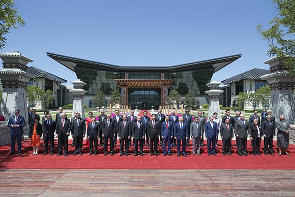 當(dāng)天中午,習(xí)近平同與會(huì)領(lǐng)導(dǎo)人和國(guó)際組織負(fù)責(zé)人以國(guó)際會(huì)議中心“漢唐飛揚(yáng)”主建筑為背景集體合影。