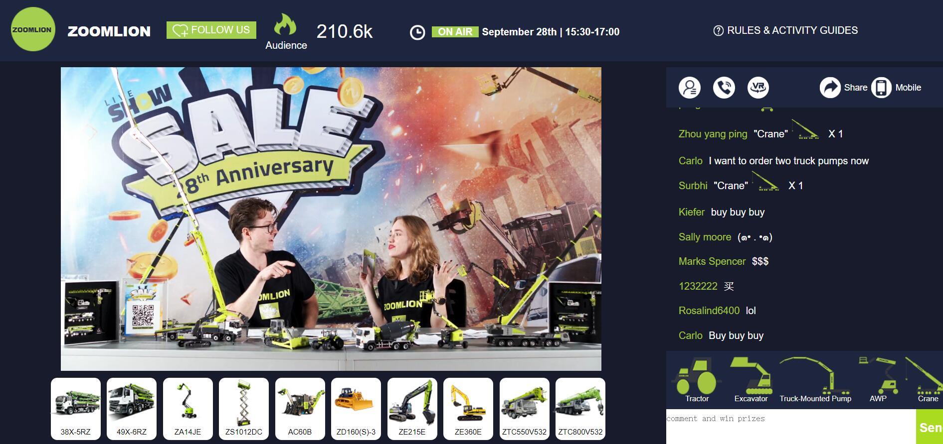 9月28日下午,中聯(lián)重科“928海外嗨購節(jié)”盛大舉行,活動吸引了來自全球各地的客戶、代理商觀摩,在線觀眾數(shù)量突破23萬,并以2.06億元的帶貨成果為海外直播寫下了良好的開篇。
