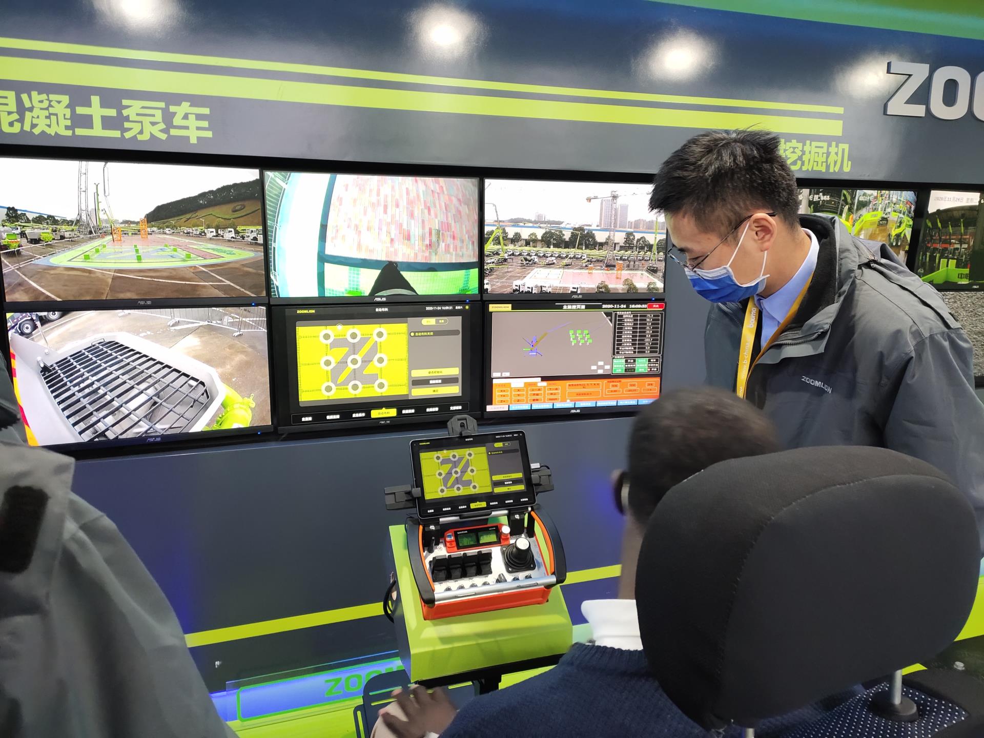 展會現(xiàn)場,一位客戶坐上混凝土泵車5G遠程操控體驗的開放式座椅,在眼前的平板電腦上隨意設置了一個布料路徑后,就通過正前方的監(jiān)控顯示屏看到了遠在長沙的泵車設備運作起來,并按照客戶所設置的路徑進行布料,非凡體驗讓客戶大呼過癮。