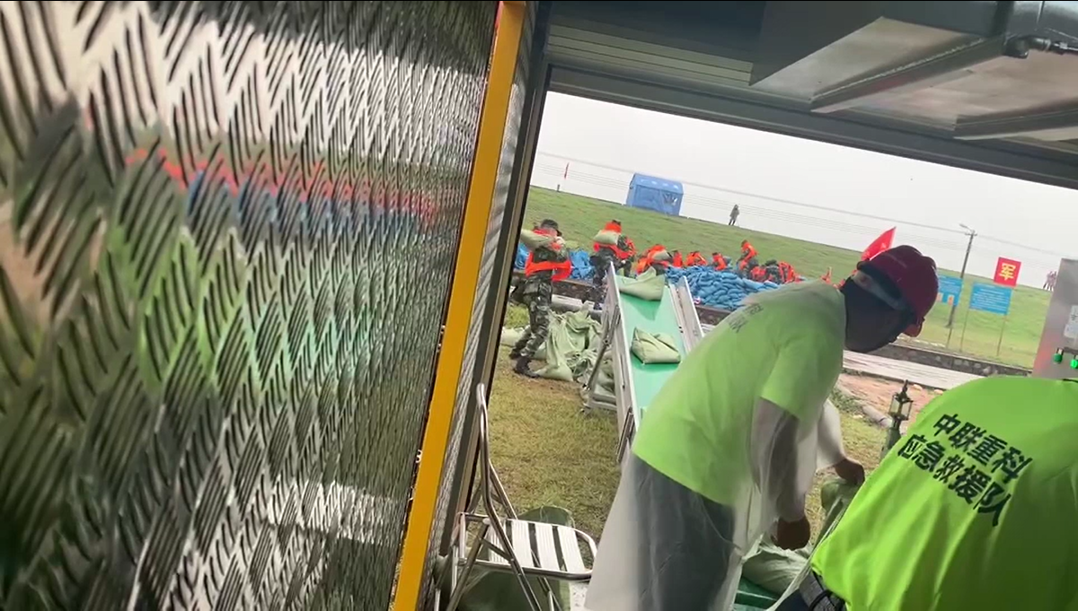 △中聯(lián)重科救援隊(duì)員在應(yīng)急砂石打包模塊車中操作