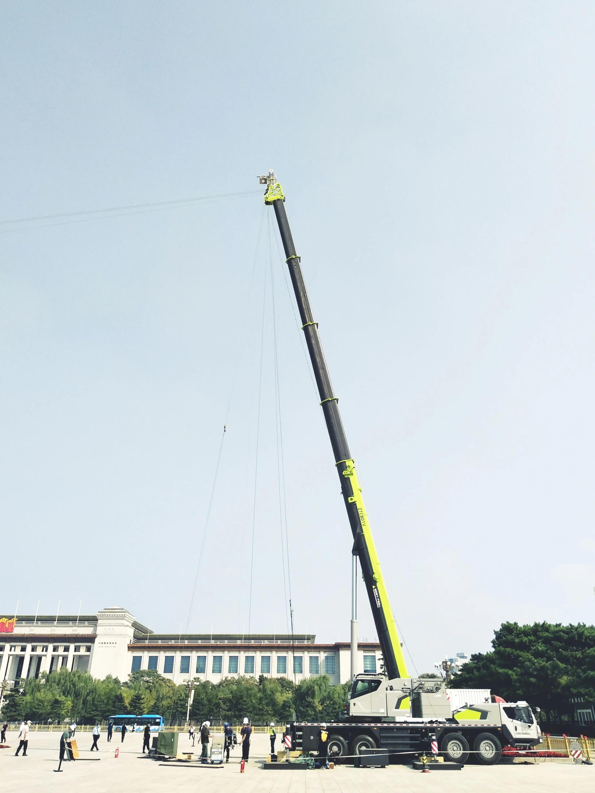 在儀式現(xiàn)場(chǎng),天安門廣場(chǎng)南北兩側(cè)位置,兩臺(tái)“極光綠”汽車起重機(jī)以卓越品質(zhì)和穩(wěn)定性能支撐搭建起一條高40米、長(zhǎng)300米的空中索道,其搭載的“天鷹座索道攝像系統(tǒng)”從高空完美呈現(xiàn)了整場(chǎng)活動(dòng)的全景視角,讓廣大觀眾更真切地感受儀式的現(xiàn)場(chǎng)氛圍。