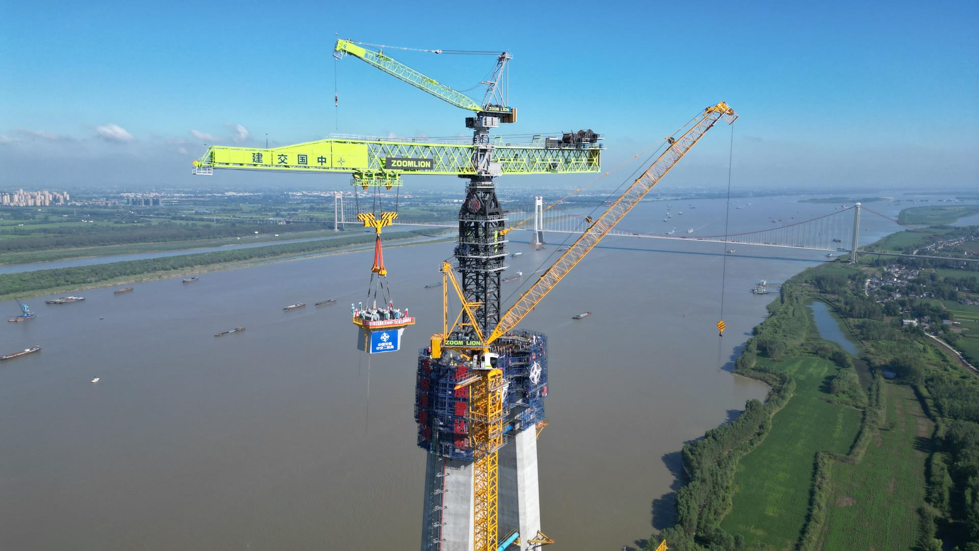▲中聯(lián)重科全球**大塔機(jī)完成馬鞍山長(zhǎng)江公鐵大橋南主塔封頂?shù)跹b