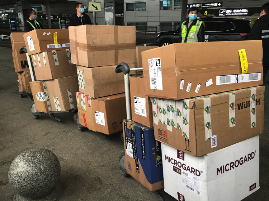 △中聯(lián)重科海外員工在法蘭克福機(jī)場準(zhǔn)備發(fā)送防護(hù)物資