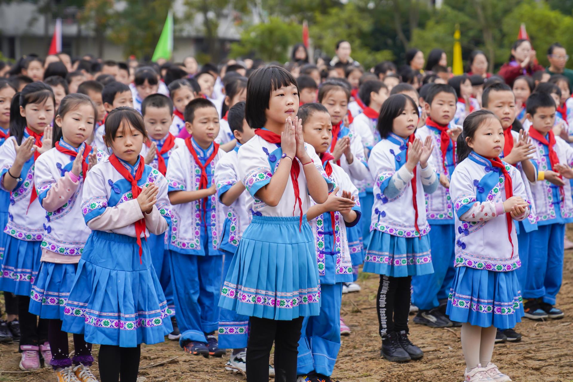 ▲里耶小學(xué)師生歡迎中聯(lián)重科一行