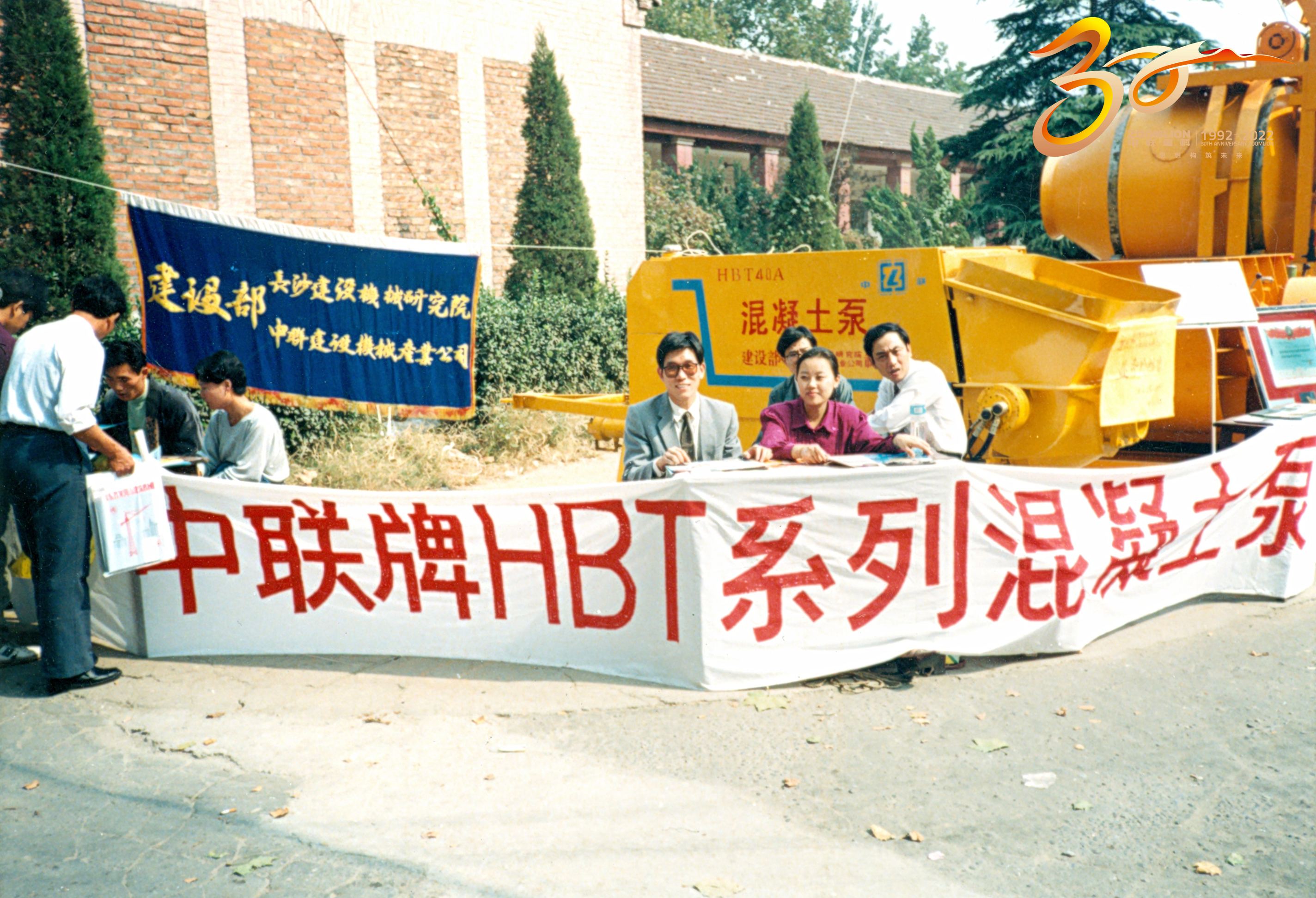 據(jù)親歷者回憶,他們打出了兩條橫幅。上面寫(xiě)著“建設(shè)部、長(zhǎng)沙建設(shè)機(jī)械研究院中聯(lián)建設(shè)機(jī)械產(chǎn)業(yè)公司”。當(dāng)時(shí),剛成立不久的中聯(lián)重科在業(yè)內(nèi)知名度不高,于是他們充分利用建設(shè)部、長(zhǎng)沙建設(shè)機(jī)械研究院的權(quán)威性和知名度,打出這條橫幅來(lái)吸引客戶。此外,桌前的這條“中聯(lián)牌HBT系列混凝土泵”橫幅還是手寫(xiě)上去的。